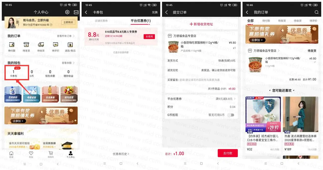 手机应用搜索下载“斑马会员”->手机号登陆后点底部跳过->个人中心->卡券包->平台优惠券->有张9-8.8元优惠券->立即使用->4样东西,鸡蛋,垃圾袋,酸辣粉,洗洁精任选一样->购买支付1元即可