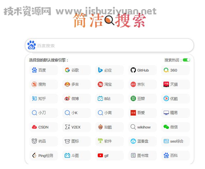 一个极简的搜索页面,纯HTML自用或上传服务器都很不错同,加入了全网资源聚合热词显示